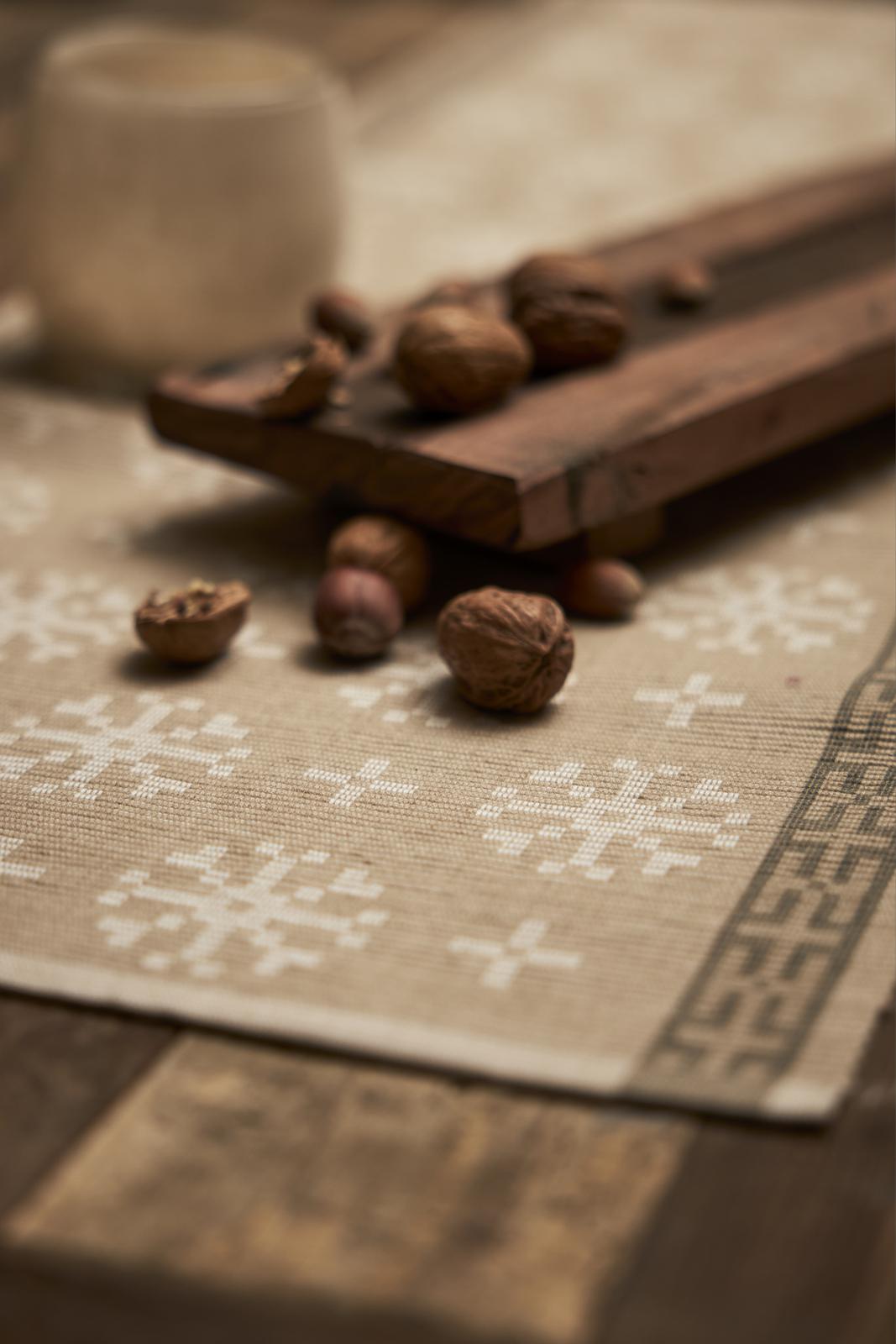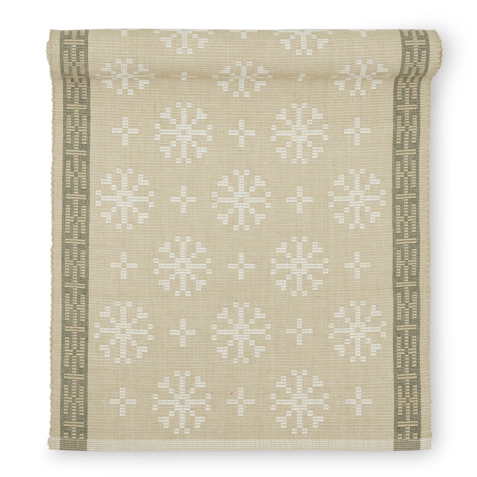 A beautiful runner with a snowflake pattern in white and beige tones.