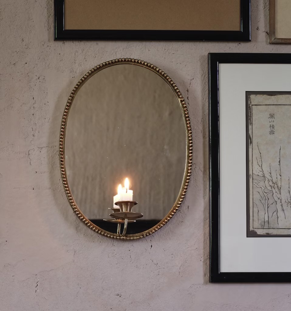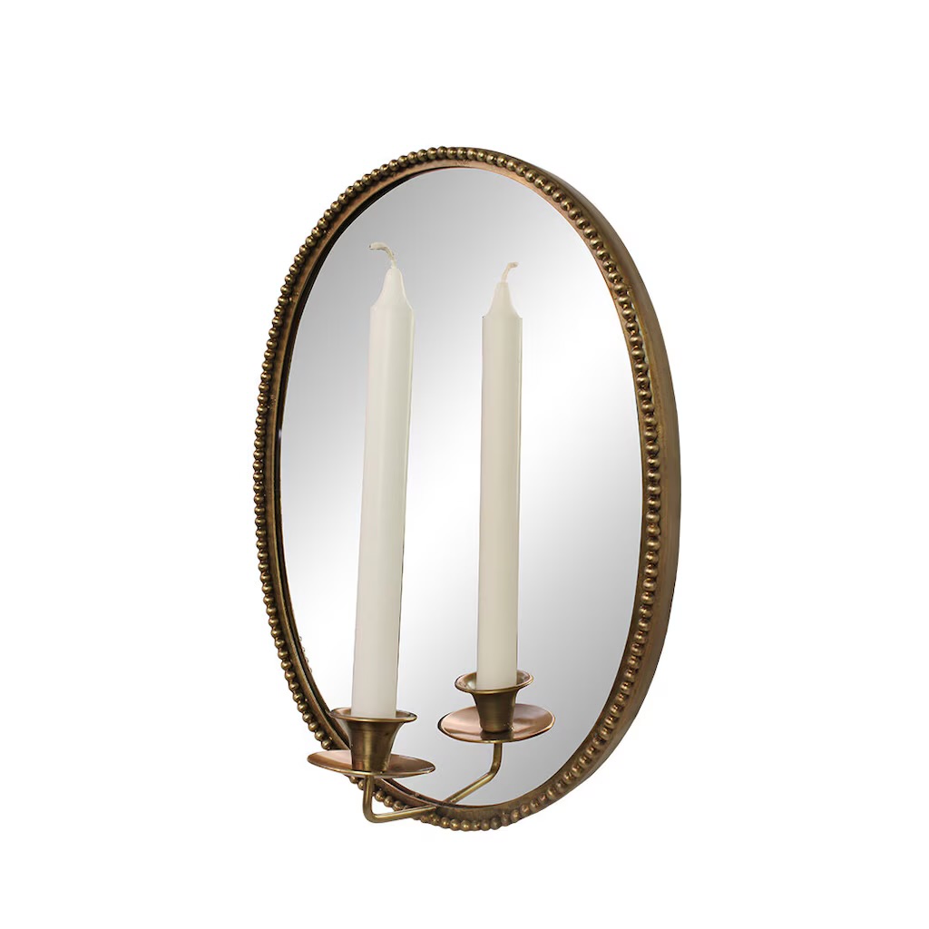 Soikea peili antiikkimessingistä viimeisteltynä, koristeellisella reunalla, jota koristavat pienet pyöreät pisteet. Messinkinen kynttilänjalka kruunukynttilälle.